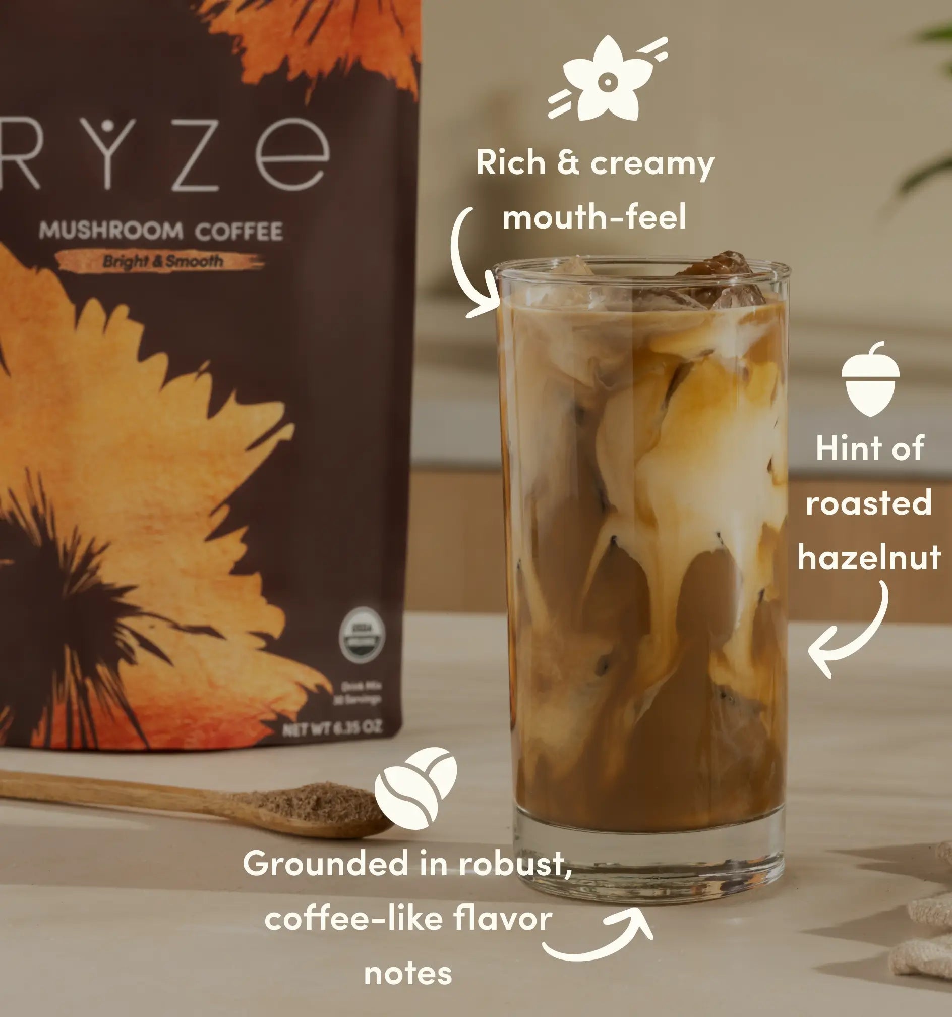 Ingredients:Organic Instant Coffee, Organic RYZE Super6™ Mushroom Blend (Cordyceps, Reishi, Turkey Tail, King Trumpet, Shiitake, Lion's Mane), Organic Prebiotic Blend (Acacia Fiber, Inulin Fiber, Tapioca Fiber).